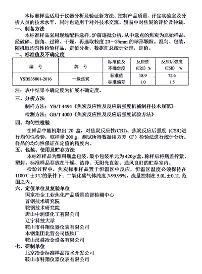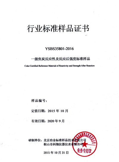 本標(biāo)準(zhǔn)樣品適用于儀器分析及驗(yàn)證新方法、控制產(chǎn)品質(zhì)量、評定實(shí)驗(yàn)室及分析人員的技術(shù)水平,同時(shí)也適用于對外技術(shù)交流、貿(mào)易中對焦炭的評價(jià)及仲裁。 制備方法: 本標(biāo)準(zhǔn)樣品采用現(xiàn)場配料選樣,爐前逐批分析,從中選點(diǎn)的焦炭為原始樣品,經(jīng)破碎、倒角、過篩、干燥,再選取粒度23—25mm的球形顆粒?;靹颉b,隨機(jī)取均勻性檢驗(yàn)樣品,定值分析,數(shù)據(jù)匯總統(tǒng)計(jì)處理,定值。 標(biāo)準(zhǔn)值及不確定度: 編號 | 牌號 | 標(biāo)準(zhǔn)值及不確定度 | 反應(yīng)性(CRI)% | 反應(yīng)后強(qiáng)度(CSR)% | YSBS35801-2016 | 一級焦炭 | 標(biāo)準(zhǔn)值 標(biāo)準(zhǔn)偏差 | 18.9 1.0 | 72.6 1.5 |