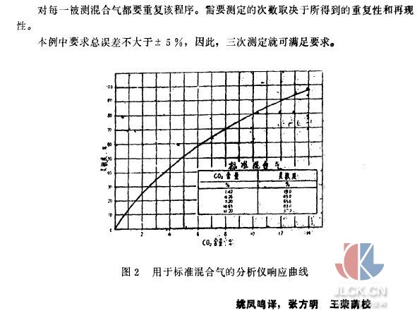 在0~10~30~50~75和95%的有用分析儀范圍內(nèi),用標(biāo)準(zhǔn)混合氣測定非色散紅外分析儀的響應(yīng)值。選擇這些點(diǎn)數(shù)以準(zhǔn)確地確定分析儀響應(yīng)值,以得到所需的總誤差為士5%。回歸計算之后畫出分析儀響應(yīng)曲線,示于圖2。儀器的響應(yīng)值易發(fā)生小的變化,這些變化要參照標(biāo)準(zhǔn)混合氣來校正,該標(biāo)準(zhǔn)混合氣的濃度非常接近于待測混合氣。這些變化的程度只能以特定的儀器通過經(jīng)驗來測定。在本例中,分析儀響應(yīng)曲線在任何點(diǎn)變化必須小于相對值士2%。如果這樣,或如果響應(yīng)值的穩(wěn)定度未知,則整個響應(yīng)曲線在每次使用時必須重新確定。