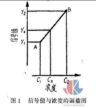 應(yīng)用兩個標(biāo)準(zhǔn)混合氣時可忽略分析儀響應(yīng)曲線的形狀。標(biāo)準(zhǔn)混合氣的成分必須與波分析混合氣的成分相同。令Y表示由濃度C得到的分析儀示值,給定C1< Cx 近C x,這樣,AB段與此測量范圍內(nèi)的分析儀曲線相重合〔見圖1)。