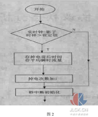 3.2掉電次數(shù)和時(shí)間的記錄 當(dāng)?shù)綦姾?程序停止運(yùn)行,所以,影子時(shí)鐘也停止工作,影子時(shí)鐘記錄了掉電前1s的時(shí)刻。而DS1302的備用電池保證了其實(shí)時(shí)鐘繼續(xù)工作(計(jì)時(shí))。每次上電,程序首先將實(shí)時(shí)鐘數(shù)據(jù)讀出和影子時(shí)鐘進(jìn)行比較,若二者之差大于設(shè)定值,則表明有1次掉電,此時(shí)的實(shí)時(shí)鐘數(shù)據(jù)為上電的時(shí)刻,影子時(shí)鐘為掉電時(shí)刻,二者之差為這次掉電時(shí)間。將掉電前后的時(shí)刻、掉電次數(shù)計(jì)數(shù)器加1后以及掉電時(shí)間累積(掉電前后之差)保存數(shù)據(jù)到6116內(nèi)。估算掉電時(shí)間段的累計(jì)流量,若采用掉電前平均的瞬時(shí)流量進(jìn)行計(jì)算,就要計(jì)算平均瞬時(shí)流量,為此,要記錄第一次上電的時(shí)間,用現(xiàn)在的時(shí)間減去第一次上電時(shí)間為儀表工作時(shí)間(近似),用累計(jì)流量除以工作時(shí)間即為平均瞬時(shí)流量,平均瞬時(shí)流量乘以這次的掉電時(shí)間就是掉電時(shí)間段的累積流量。當(dāng)然,估算掉電時(shí)間段流量的方法很多種,設(shè)計(jì)一個(gè)參數(shù)來確定哪一種方案,由供方和用戶方協(xié)商來選擇。 3.3程序框圖 程序框圖如圖2所示,程序開始首先判斷實(shí)時(shí)鐘和影子時(shí)鐘之差是否大于設(shè)定值,不大于說明沒有掉電,繼續(xù)執(zhí)行;若大于設(shè)定值說明一次掉電,保存數(shù)據(jù),估算掉電時(shí)間段的流量。