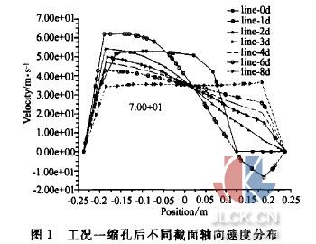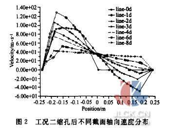 圖1為工況一擋板后區(qū)域不同截面軸向速度分布。橫坐標為中心截面上X方向的位置,縱坐標為軸向(Z方向)速度分布。圖中7條曲線分別表示檔板處、檔板后1倍管徑處、2倍、3倍、4倍、6倍及8倍管徑處的軸向速度分布.通過比較分析可以看出左右偏差隨著遠離檔板而削弱的過程,在8倍管徑處(即彎頭人口截面)這種不均勻性已經(jīng)消失。還可看出在1倍管徑處存在明顯的回流區(qū),而且回流速度最大達到12m/s. 圖2為工況二時的情況。此時,由于縮孔開口減小,縮孔擋板后的左右不均勻性更大,回流區(qū)長度更長,在3倍管徑處仍然存在負速度。