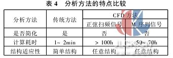 從計算分析方法的特點來看,傳統(tǒng)分析與CFD分析方法在簡化性、計算耗時性和結(jié)構(gòu)適應性等方面均存在差異,不同分析方法的特點比較如表4所示:兩種CFD方法均比傳統(tǒng)方法計算耗時量大得多;CFD的優(yōu)勢在于無須簡化,對于復雜結(jié)構(gòu)的適應性更強;在兩種CFD方法中,M序列激勵由于一次可以獲得一定范圍的頻率響應,因此比使用正弦掃頻信號耗時少。