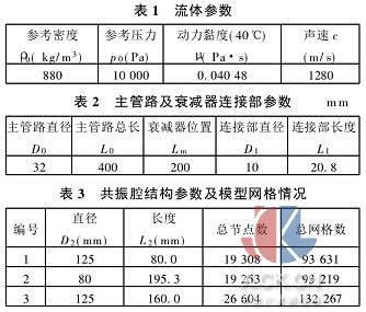 計算所用流體為46號抗磨液壓油,其物理參數(shù)如表1所示。根據(jù)實際液壓系統(tǒng)中管道的幾何尺寸,主管路及連接部的結(jié)構(gòu)參數(shù)如表2所示。網(wǎng)格的劃分采用四面體網(wǎng)格,共振腔結(jié)構(gòu)參數(shù)及模型節(jié)點總數(shù)和網(wǎng)格總數(shù)見表3。