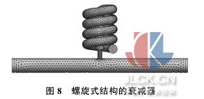 為驗證文中所述分析方法的適應性,對圖8所示的螺旋形衰減器結(jié)構(gòu)進行分析,圖中主管路和連接部的尺寸同表2,螺旋結(jié)構(gòu)的管內(nèi)徑為20mm,總長度為875mm。如采用傳統(tǒng)計算方法,這種結(jié)構(gòu)基本上無法計算;采用CFD計算時無須簡化,直接劃分網(wǎng)格,設定邊界條件、流體屬性后即可進行計算。