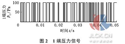 移位寄存器初始值全置為1。所得到的p1端前半周期的壓力信號如圖2所示。出口端(即圖1中2端)及其他邊界均設置為剛性壁面。