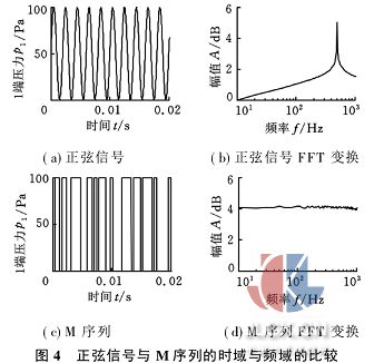 如圖4所示,正弦信號對應一個頻率,在一次模擬中可以使用一個或多個頻率疊加起來共同作用,要得到一定范圍的頻率響應,需要數(shù)次模擬才行;M序列則對應一定范圍內(nèi)的頻率,可以在一個周期內(nèi)一次性地模擬衰減器的頻率響應。