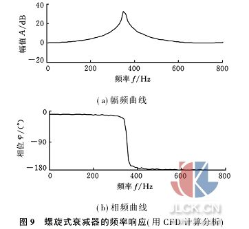 圖9所示為通過CFD計算得出的圖8所示螺旋結(jié)構(gòu)衰減器的頻率響應。計算結(jié)果表明:利用M序列作為激勵信號,通過CFD模擬的方法可以勝任復雜結(jié)構(gòu)衰減器的頻率響應分析。