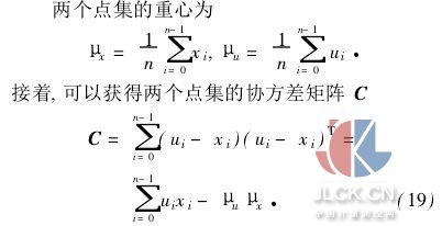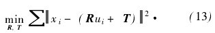 假設(shè)一一對應(yīng)的兩個空間點(diǎn)集U和X的坐標(biāo)已給定,每個點(diǎn)集有n個點(diǎn), U={ui,i=0,1,2,…, n}和X={xi,i=0,1,2,…, n},每對點(diǎn)ui,xi有m個坐標(biāo)ui=(ui1,ui2,…,uim),xi=(xi1,xi2,…,xim)·為了使它們配準(zhǔn)起來,就是要找到最優(yōu)的旋轉(zhuǎn)矩陣R和平移向量T,滿足目標(biāo)表達(dá)式