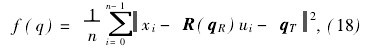 使用四元數(shù)表示R3中的旋轉(zhuǎn),需要計算四個旋轉(zhuǎn)參數(shù)和三個平移參數(shù)來評估兩個點(diǎn)集之間的移動·將這些參數(shù)放入一個向量q=[qT,qR]中,qT表示平移向量,qR表示旋轉(zhuǎn)向量·配準(zhǔn)的目標(biāo)表達(dá)式就可以轉(zhuǎn)換為式(18),也就使得目標(biāo)函數(shù)f(q)的值最小