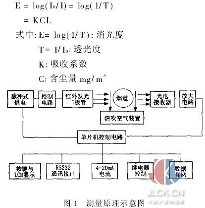 1引言 隨著我國(guó)國(guó)民經(jīng)濟(jì)的迅速發(fā)展,除廢氣、廢水外,顆粒狀粉塵、煙塵向大氣排放所造成的環(huán)境污染已成為一個(gè)十分突出的問(wèn)題。由于煙塵粉塵排放的顆粒粒徑很小(微米數(shù)量級(jí)),加上工業(yè)現(xiàn)場(chǎng)的惡劣環(huán)境(如高溫),給煙塵粉塵排放的監(jiān)控和檢測(cè)帶來(lái)極大的困難。目前,煙塵粉塵在線監(jiān)測(cè)儀大多采用國(guó)外儀器,成本高,影響了它的推廣使用,阻礙了環(huán)境治理的順利推進(jìn)。 錦州華冠環(huán)境科技實(shí)業(yè)公司采用先進(jìn)的電子測(cè)量技術(shù),將光、機(jī)、電技術(shù)相結(jié)合,成功研制了HG-HC智能煙塵粉塵測(cè)量?jī)x。該儀器功能全、成本低、可靠性高,可廣泛應(yīng)用于建材工業(yè)(水泥廠、石膏產(chǎn)品)、煤礦、冶金企業(yè)、造紙企業(yè)、玻璃企業(yè)、鋼鐵廠的高爐、顆粒生產(chǎn)企業(yè)、發(fā)電廠、工業(yè)及民用鍋爐、垃圾焚化廠、硫化車(chē)間、食品加工廠等生產(chǎn)過(guò)程中產(chǎn)生的煙塵粉塵濃度和排放量的測(cè)定。完全能夠滿足現(xiàn)場(chǎng)在線測(cè)量的要求。 2工作原理 煙塵(粉塵)測(cè)量方法主要有光學(xué)法、采樣稱重法和靜電法三種。采樣稱重法不適合于在線測(cè)量。靜電法易受干擾,國(guó)內(nèi)技術(shù)并不成熟。光學(xué)法又進(jìn)一步分為濁度法和散射法,而濁度法是目前國(guó)外普遍采用的用來(lái)測(cè)量煙塵(粉塵)濃度的方法,這種國(guó)外儀器在國(guó)內(nèi)許多單位也都得到了成功應(yīng)用。光學(xué)法測(cè)量的缺點(diǎn)是需要保持光學(xué)鏡頭的相對(duì)清潔。對(duì)于煙道中煙塵的測(cè)量,實(shí)踐證明,通過(guò)微正壓的清潔保護(hù)風(fēng),就可實(shí)現(xiàn)對(duì)光學(xué)鏡頭的可靠保護(hù)。 HG-HC智能煙塵粉塵測(cè)量?jī)x是一光學(xué)式電子儀器,是一種在線監(jiān)測(cè)儀器。它的檢測(cè)原理是基于光學(xué)式檢測(cè)法中的濁度法?;诶什畷r(shí)—比爾定律,測(cè)量光透過(guò)被測(cè)物質(zhì)后,由于散射和吸收而使光強(qiáng)減弱,通過(guò)測(cè)定光束通過(guò)被測(cè)介質(zhì)前后的光強(qiáng)比值來(lái)定量煙塵粉塵濃度。檢測(cè)原理及系統(tǒng)結(jié)構(gòu)如圖1所示。 當(dāng)紅外光穿過(guò)含顆粒物的煙塵粉塵時(shí),發(fā)射器紅外光源光強(qiáng)I0會(huì)因被測(cè)物質(zhì)的散射和吸收而使接收器接收到的光強(qiáng)衰減為I,依據(jù)郎伯特—比爾定律: