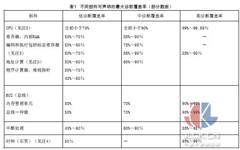 e、 考慮診斷測試的作用,對每一部件或組件的每一失效模式,估算診斷測試可檢測到的安全失效分?jǐn)?shù)(dc S)和診斷測試可檢測到的危險(xiǎn)失效分?jǐn)?shù)(dc D ),從而將失效率細(xì)分為可檢測到的安全失效(l S D )、不可檢測到的安全失效(l S U )、可檢測到的危險(xiǎn)失效(l D D )、不可檢測到的危險(xiǎn)失效(l SU )。在估算dc S 、dc D 的過程中,對于簡單的部件,其短路和開路失效可以被100%的診斷覆蓋率檢測到,但是對于復(fù)雜的B類部件,一般來說很難清晰全面的羅列出所有的失效模式及其關(guān)聯(lián)影響,或者由于技術(shù)等方面的限制很難被100%的診斷檢測到,因此,其診斷覆蓋率的最高聲明值被加以限制(見表1,詳細(xì)信息請參見GB/T 20438-2附錄A)。我們在估算時(shí)應(yīng)考慮這些限制,否則將需要給出詳細(xì)的說明來證明該估算的可靠性。