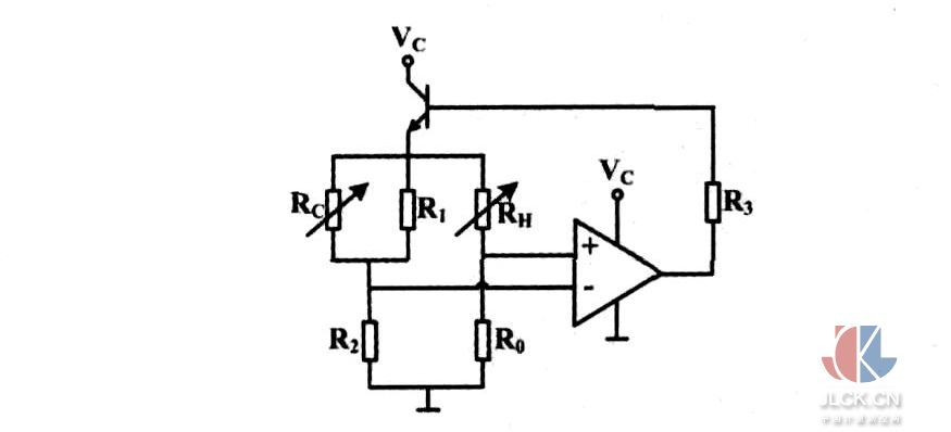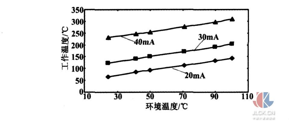 圖2溫度特性曲線圖 Fig. 2The curves of the temperature characteristics 由圖2可以看出,在靜止氣流和恒流供電情況下,組合鉑膜探頭工作溫度隨環(huán)境溫度的提高基本呈線性提高,即探頭工作溫度與環(huán)境溫度之間的溫差基本保持不變。當(dāng)組合鉑膜探頭溫差較低時(shí),探頭的靈敏度不高,而溫差太大,容易造成探頭的損壞。所以,最終確定組合鉑膜探頭工作電流應(yīng)在30mA左右,這時(shí)探頭具有較高的靈敏度,探頭也不易損壞。 溫度補(bǔ)償是使電路能自動地根據(jù)氣流溫度變化改變探頭的工作溫度,實(shí)現(xiàn)在相同流量下輸出與氣流溫度變化無關(guān)的穩(wěn)定電壓。溫度補(bǔ)償電路如圖3所示。