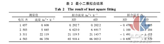 圖4熱式流量計(jì)輸出擬合曲線 Fig. 4The output fitting curve of the thermal flowmeter 由圖4所示曲線可知,可采用多項(xiàng)式對其進(jìn)行擬合。于是,選取多項(xiàng)式{x0,x1,…,xm}為基,進(jìn)行多項(xiàng)式最小二乘曲線擬合。分別取m=3和m=4進(jìn)行擬合,其結(jié)果如表2所示。