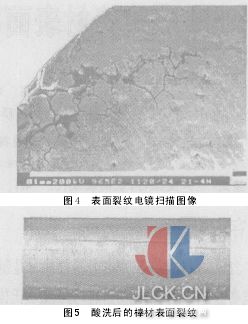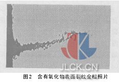 2.2如果表面裂紋寬度非常微小,如圖2裂紋寬度只有0.017 mm,在鋼中視為異質(zhì)薄層。這時的聲壓反射率≈0,聲壓透射率≈1。分析表明,超聲波在遇到非常致密的微小裂紋時,聲波透射多,探頭接收的裂紋反射波較少,靈敏度降低,有時雖然自然傷裂紋深度超標,但寬度非常窄,視為異質(zhì)薄層,仍有超聲波透射過裂紋繼續(xù)前進,使得裂紋不能報警檢出。 2.3由于裂紋界面的不平整,會產(chǎn)生超聲波常見的散射衰減。如果標準傷和裂紋深度一樣(長度不計),那么裂紋反射率會比標準傷低。見圖2,圖4。 圖4為21-4N冷拉棒材表面裂紋缺陷。此缺陷未被超聲波檢出,這是人工抽查發(fā)現(xiàn)的。缺陷徑向深度0.06 mm,截面總長度約0.1 mm。裂紋呈網(wǎng)狀,內(nèi)含夾雜物,散射衰減極強,所以此類缺陷易漏檢。將此棒材酸洗后,裂紋內(nèi)氧化物被酸洗掉,裂紋暴露明顯,再用同樣的靈敏度探傷就可以檢出。見圖5。