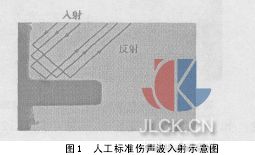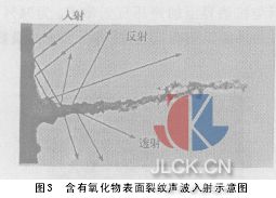 圖2中裂紋深0.12 mm,比人工標準傷0.05 mm深一倍多,但裂紋反射波低于人工標準傷反射波,所以未報警,造成漏檢。分析說明,鋼基體與金屬氧化物聲阻抗值相差較小,聲壓反射率RB經(jīng)計算約為42%。鋼與鋁聲壓反射率RB為45%,所以金屬氧化物聲學(xué)特性與鋁聲學(xué)特性相似。同樣大小的缺陷,由于耦合界面兩種物質(zhì)聲阻抗的差值不同,會呈現(xiàn)不同的靈敏度。鋼基體與金屬氧化物聲壓反射率RB為42%,明顯低于鋼與機油界面的聲壓反射率RB(94%),一部分聲波透過金屬氧化物繼續(xù)向前傳播,所以,含有金屬氧化物的裂紋比無填充物的裂紋較難檢出,見圖3所示。