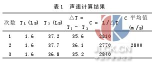 2.3聲速測定 利用CTS-25型時間讀數(shù)裝置,取一試樣 50×100 mm,用50KC-28探頭,測量超聲波通過試樣時間,并計算聲速(見表1)。
