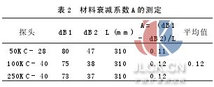 △T=T2-T1(1) 式中T1—兩探頭相接,超聲波不通過碳棒的時間 T2—兩探頭通過碳棒對接超聲波通過碳棒的時間 △T—超聲波在碳棒中傳播時間 C=L/△T(2) 式中C—聲速,m/s L—試件長度,mm 2.4材料衰減系數(shù)α的測定 將發(fā)射和接收探頭對接,調(diào)節(jié)衰減器,使基準為80%滿刻度,讀出dB1;再將兩探頭通過試棒,使接收波仍調(diào)到80%滿刻度,讀出dB2,然后計算出α如下(見表2):