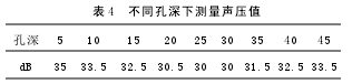 2.6“孔深—聲壓”曲線制作 將兩探頭中心對準試棒不同孔深同一直徑長橫孔,調(diào)節(jié)儀器,使接收的聲波為80%滿刻度,測量聲壓值(表4)。其孔深與聲壓曲線圖見圖4。
