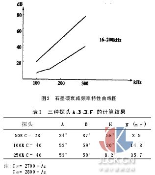 α= (dB1 -dB2)/L(3) 式中α—超聲波在碳棒中傳播時的衰減系數(shù),dB/mm dB1—兩探頭不通過碳棒對接的接受聲壓 dB2—兩探頭通過碳棒對接時的接受聲壓 L—碳棒長度,mm 2.5頻率及探頭選擇原則 根據(jù)石墨碳的頻率特性曲線(見圖3),最好用16-200 kHz頻率探頭,探頭尺寸大,通過材料的聲能也大,頻率高,擴散角θ小,指向性好,發(fā)現(xiàn)遠距離小缺陷的能力高,但近場長度較長。本文所使用的三種探頭的α、β、θ、N計算如下(見表3): N=D2/4λ(4) 式中N—近場區(qū)長度 D—探頭晶片直徑 λ—波長 θ= 29λ/D(5) 式中θ—半擴散角 λ=C/f(6) 式中C—聲速 f—探頭振動頻率 sinα=d/2R(7) 式中α—入射角 R—探頭晶片半徑 sinβ= sinα×C碳/C環(huán)(8) 式中β—折射角 C環(huán)—超聲波在環(huán)氧樹脂中的聲速 C碳—碳棒中的聲速